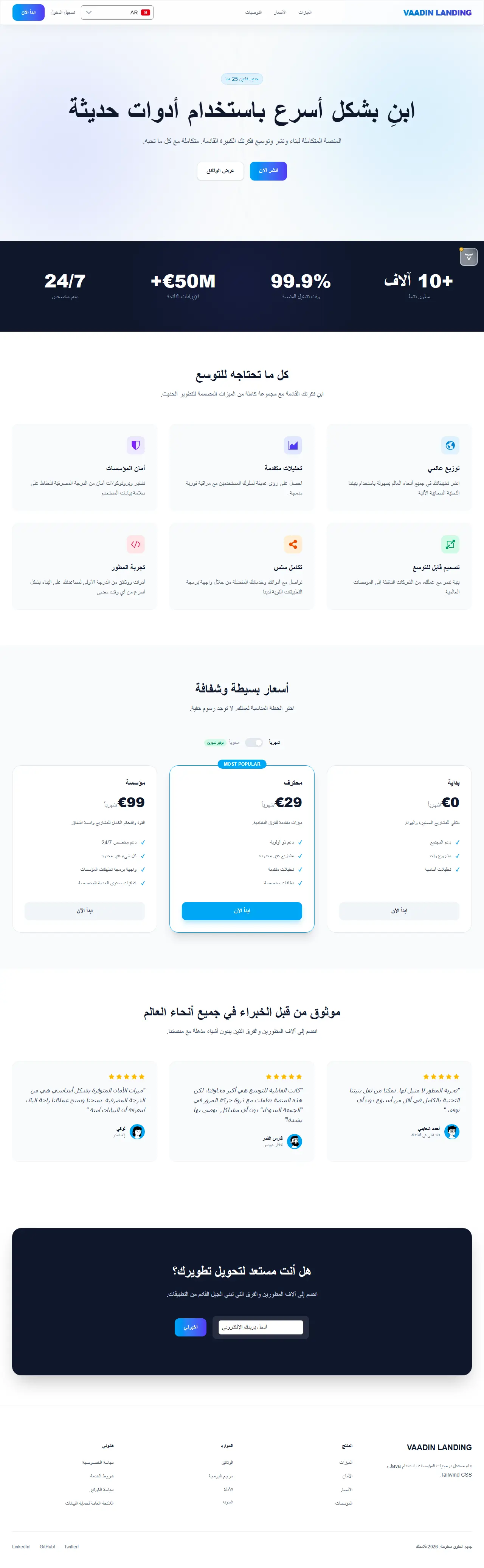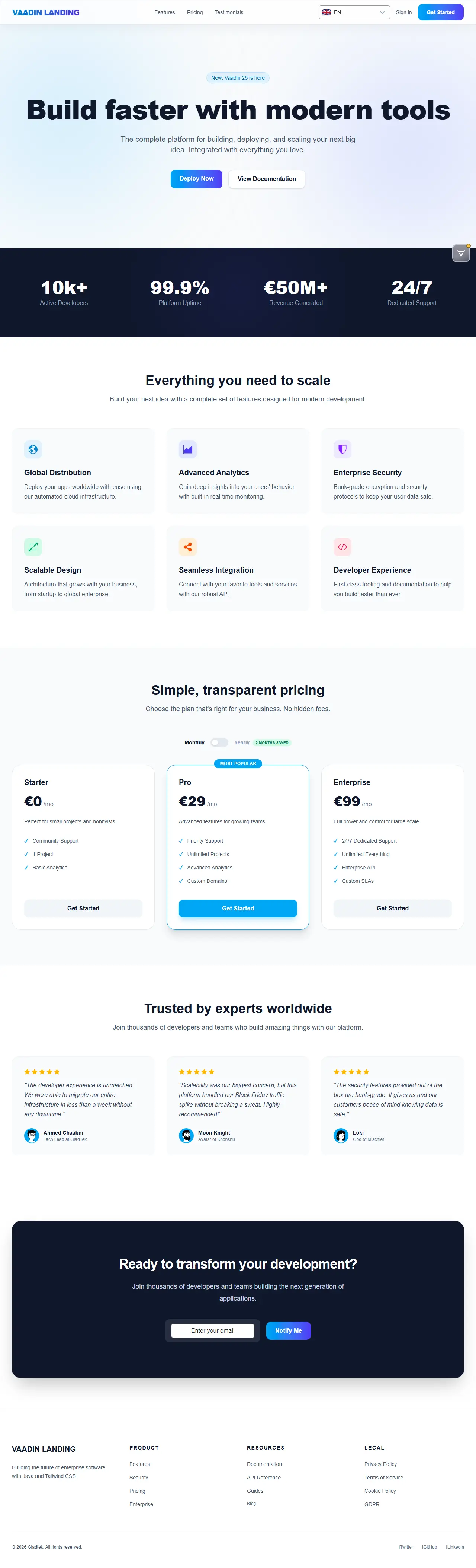 Once the app is running, you will see the complete landing page built with Vaadin 25 and styled using Tailwind utilities.